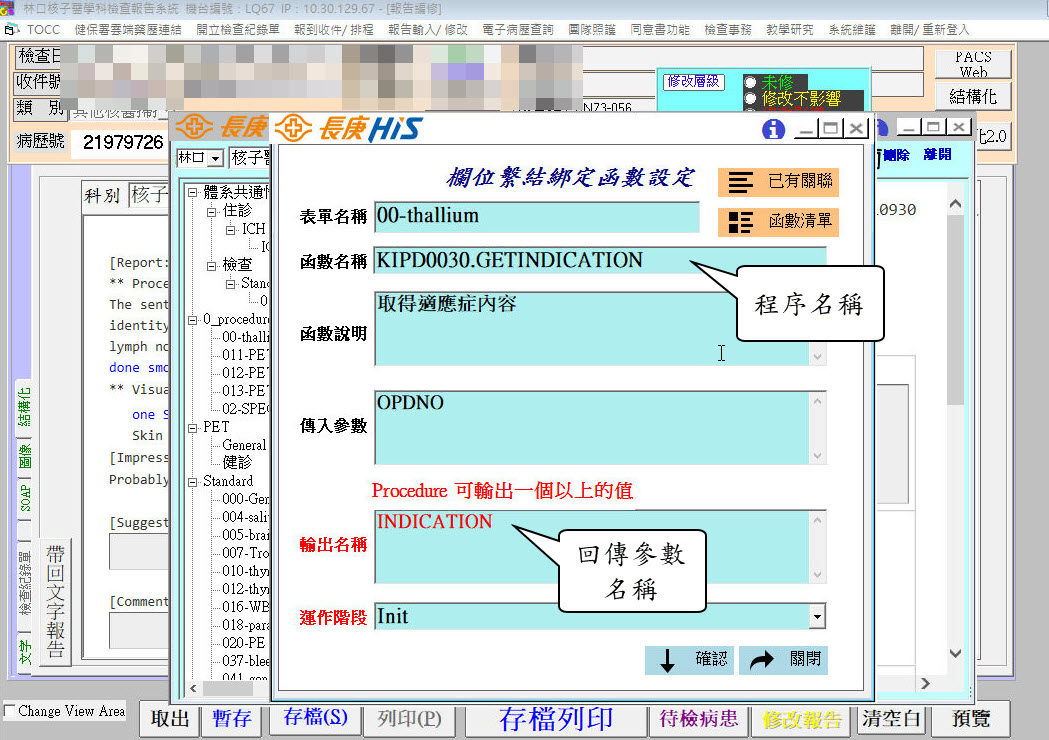 * HIS 繫結函數名稱 : **InName** 輸入funcName 函數名稱，例如: KIPD0030.GETINDICATION。