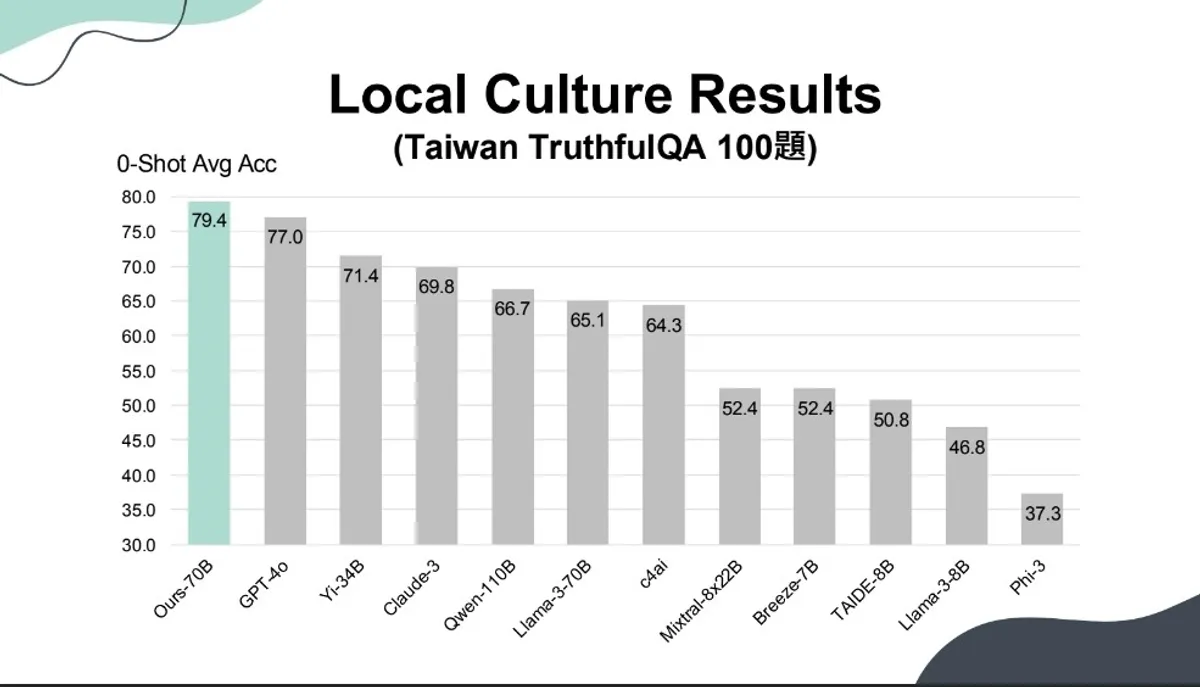 * **評價**：Project TAME 在理解台灣語境和專業知識量方面表現出色，能夠準確回答繁體中文的問題，特別是在涉及台灣特有的文化和語言時。在多項繁體中文指標和專業測試中獲得第一，比 GPT-4o 和 Google Gemini 等美國企業的模型更具優勢。適合需要快速部署和本地化支持的台灣企業。