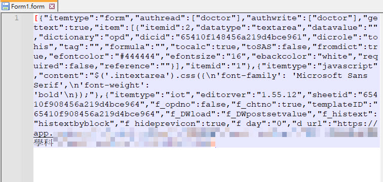 BaselineJson = "[{\"itemtype\":\"form\",\"authread\":[\"doctor\"],\"authwrite\":[\"doctor\"],\"gettext\":true,\"item\":[{\"itemid\":2,\"datatype\":\"textarea\",\"datavalue\":\"\",\"dictionary\":\"OPD\",\"dicid\":\"a3d5cc5e-7ca9-4c03-9c72-16224e30c133\",\"dicrole\":\"tohis\",\"tag\":\"\",\"formula\":\"\",\"tocalc\":true,\"toSAS\":false,\"fromdict\":true,\"efontcolor\":\"black\",\"efontsize\":\"16\",\"ebackcolor\":\"#f3f6f4\",\"required\":false,\"reference\":\"\"}],\"itemid\":\"1\"},{\"itemtype\":\"javascript\",\"content\":\"$('.intextarea').css({\\n'font-family': 'Microsoft Sans Serif',\\n'backgound':'white',\\n'font-weight': 'bold',\\n});\"},{\"itemtype\":\"iot\",\"editorver\":\"1.54.03\",\"sheetid\":\"\",\"recType\":\"\",\"f_opdno\":false,\"f_chtno\":true,\"f_DWload\":\"f_DWpostsetvalue\",\"f_histext\":\"histextbyblock\",\"f_hideprevicon\":true,\"f_day\":\"0\",\"d_url\":\"https://xxx/\",\"modifiedUser\":\"林xx\",\"modifiedDept\":\"林口長庚xx科\",\"modifiedDate\":1695712955859}]",