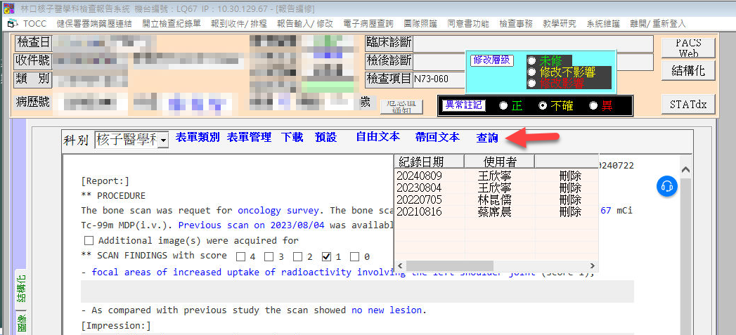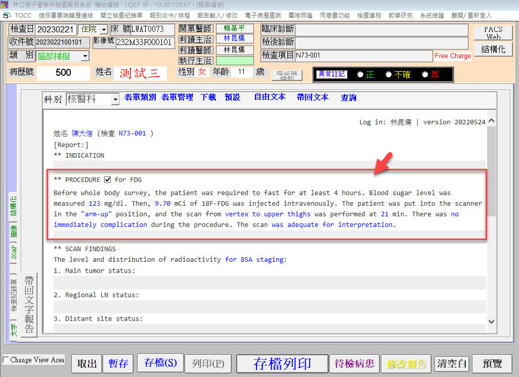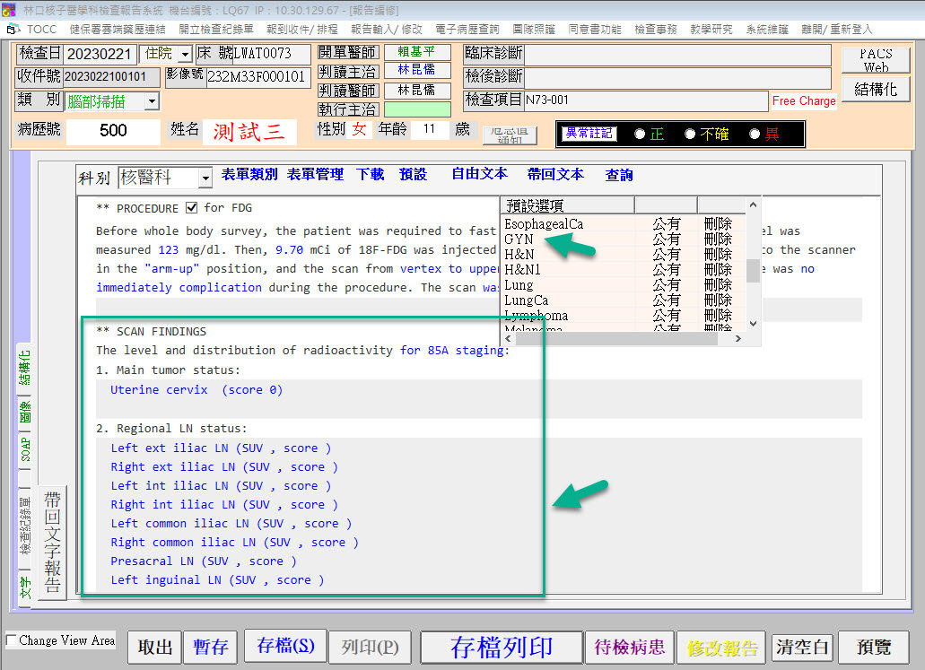 在填寫表單時，可點選 "預設" > "預設讀取"，將儲存的範本內容帶入，加速表單填寫。以下以核醫科的正子掃描通用報告為例進行說明，表單設有 SCAN FINDINGS 共通欄位，醫師可針對不同的癌症特性，預先儲存相應的內容為 "預設設定"，例如下圖帶入 GYN 預設的例子。