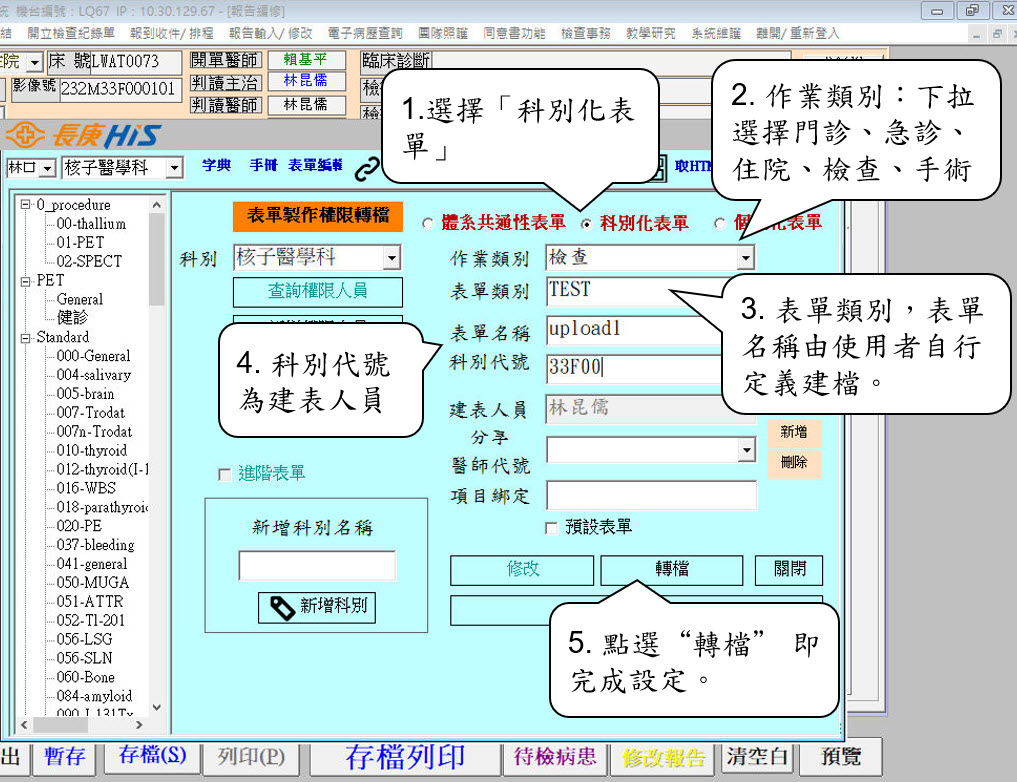 選擇表單檔案後，會帶出下面設定畫面，依序選擇 1. 表單屬性，2. 作業類別，3. 表單類別，4. 科別代號，5. 轉檔上架。