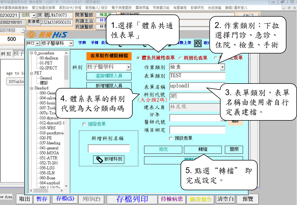 點選 "體系共通性表單"，確認作業類別，表單類別，表單名稱以及科別代號，再點選"轉檔"，即完成。其中體系共通範本上檔的科別代號會管制輸入兩馬，請填寫 [**大分類**](#user-content-fn-1)[^1] 代號，由科別代號五碼的第二三碼組成，例如林口長庚核子醫學科 33F00 的大分類代號為 3F。