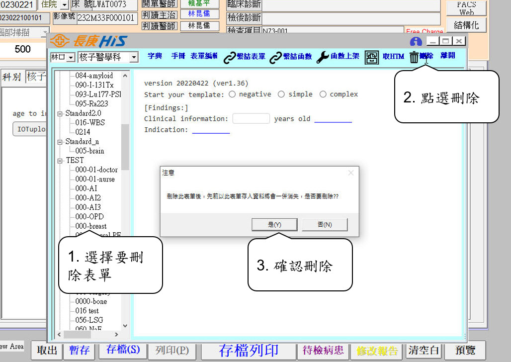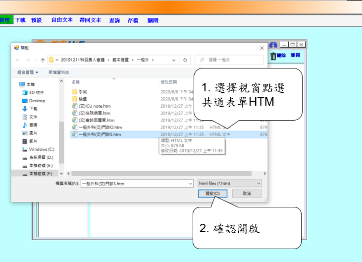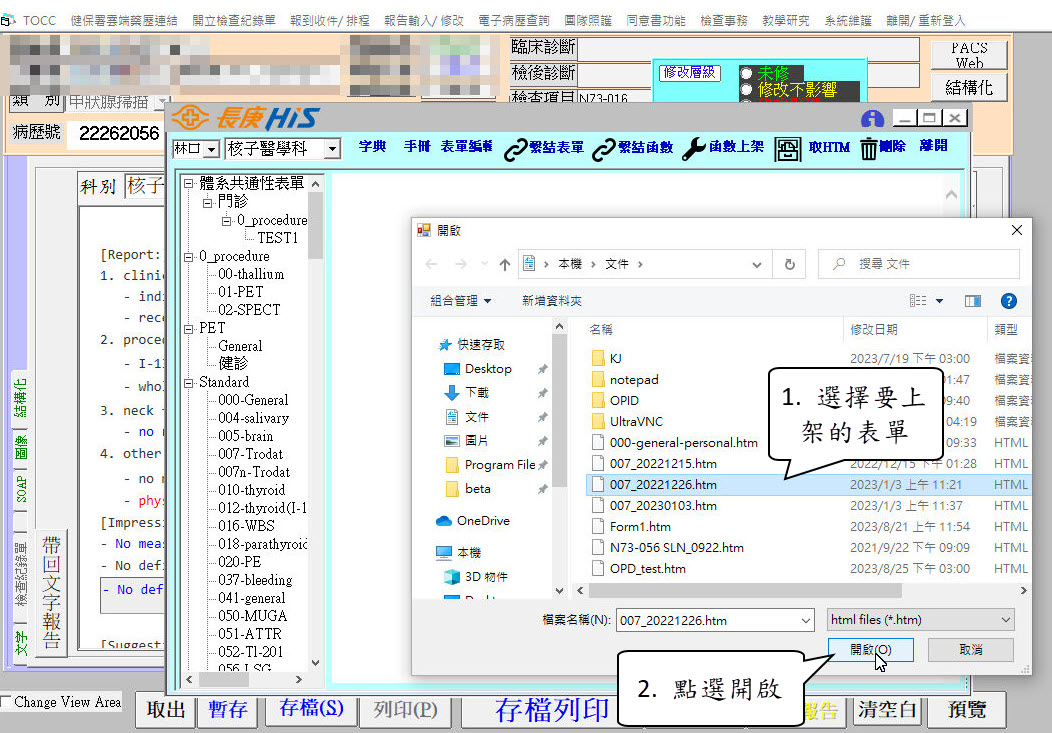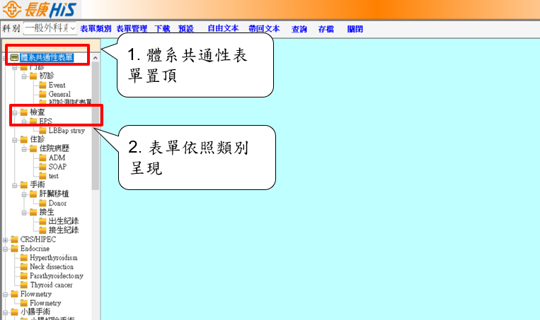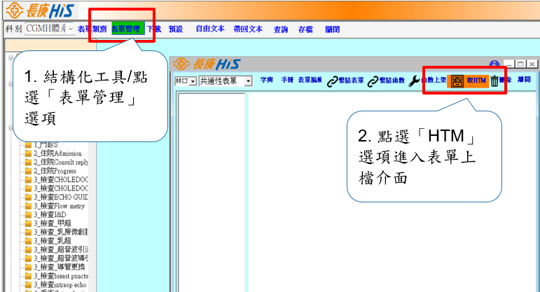 進入表單管理，選"CGMH體系"科別，取HTM，選擇視窗點選共通表單HTM，確認開啟