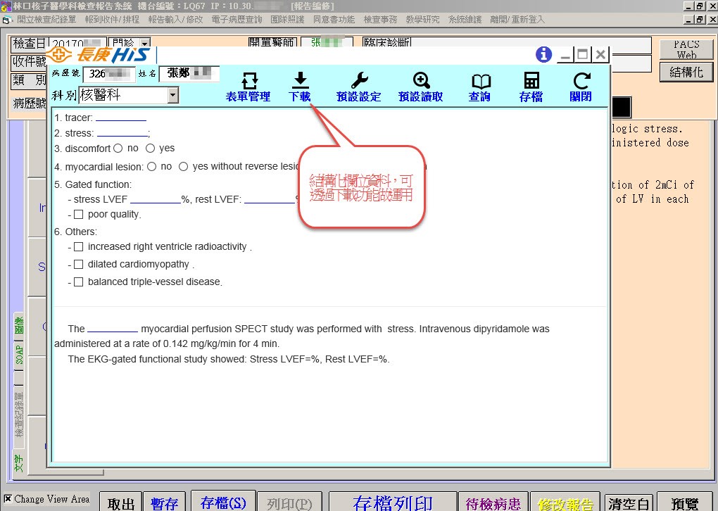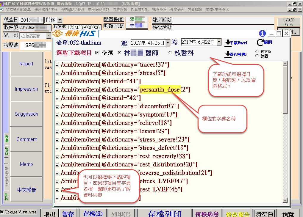 使用者可以將該表單的內容，依照日期範圍，存檔醫師，等搜尋條件，下載表單的欄位資料利用。